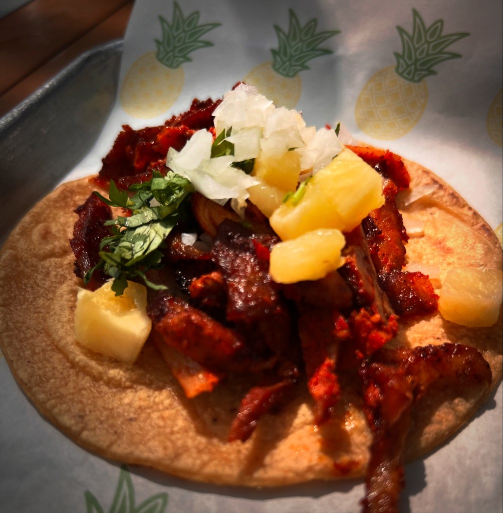 It’s a bullseye. A truly remarkable shot. Each of these tacos is more delicious than the last: the summer squash is both umami-dense and bright; the fry on the artichoke is delicate as Japanese tempura; the al pastor is a playful sweet-and-savory parry-and-thrust between pork and pineapple; the duck carnitas gleefully captures the interplay of fowl and fruit (oranges and date puree, in this case) afoot in its Chinese cousin and counterpart, Peking duck. Every taco on my plate is an achievement worthy of applause.