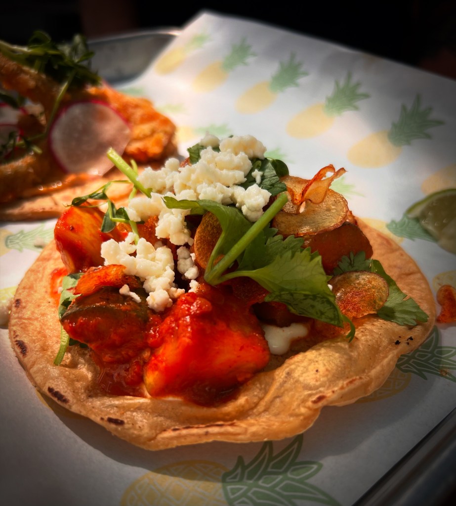 I visit Taqueria Chingon on a Tuesday, at eleven in the morning, to avoid lines for entry that routinely extend the length of a city block. At the counter, I order four tacos—duck carnitas; artichoke; summer squash; al pastor—and then sit outside, under awning, in a variegated sunlight that suffuses the dining area with the kind of otherworldly glow that every owner wishes for their restaurant, and which, here, this morning, happens naturally, courtesy of el sol.