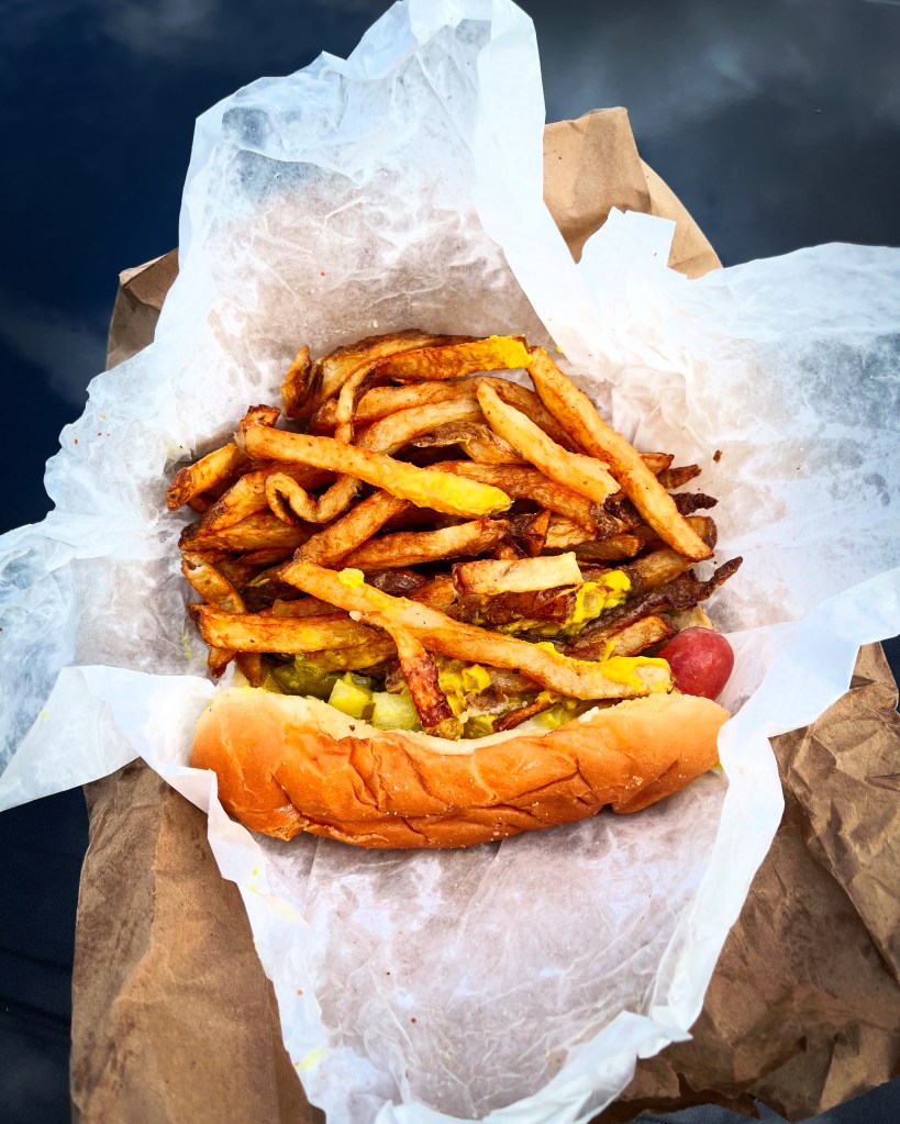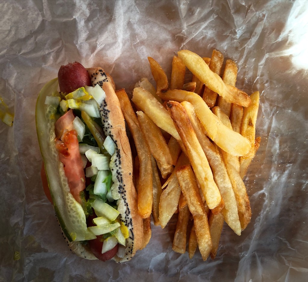 Pete’s purveys a robust array of Chicago classics—Italian beef, rib tips, Greek chicken—but it’s for their hotdogs that locals flock: all-beef Vienna dogs on Rosen’s poppy-seed buns, topped with all-things-pickled. The Chicago dogs at Pete’s are then bundled with fries inside white, butcher’s paper that steams the bun against the dog’s casing to form a perfectly integrated, umami delivery system that disgorges pleasure into the eater’s frontal lobe with each successive bite.