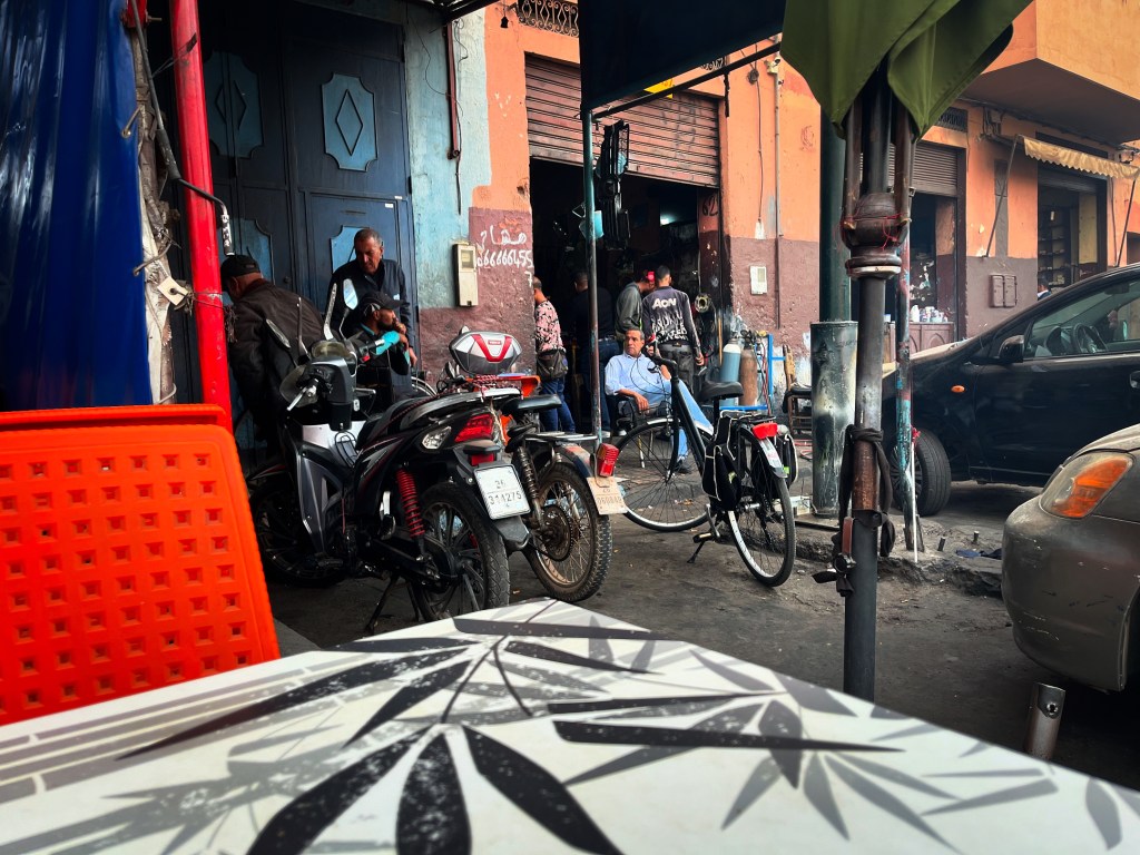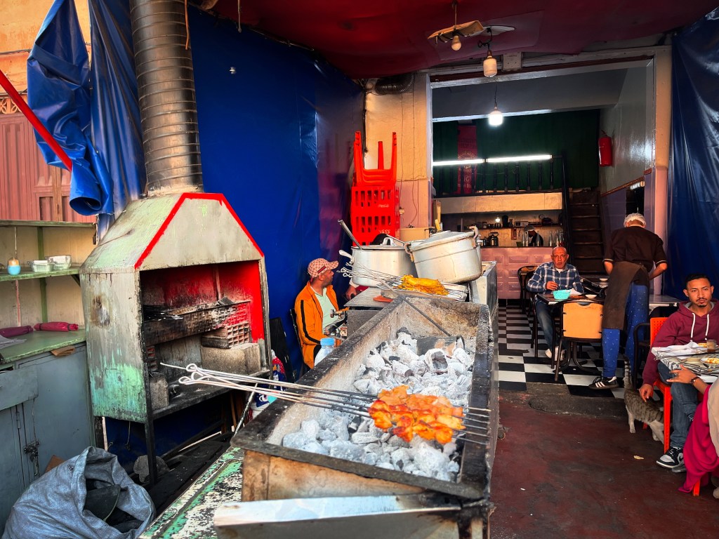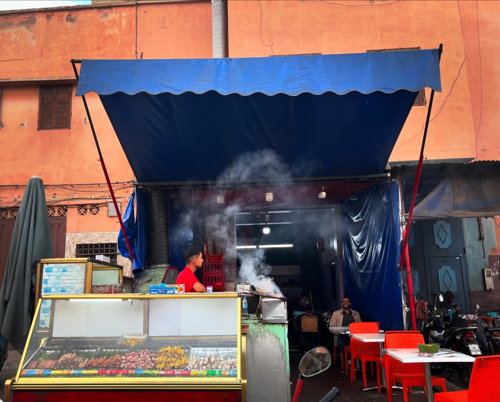 And then something caught my eye: grill smoke floating above a waiting line of taxi cabs. This was the convergence of two things—hungry drivers and available food—that inevitably portends that good stuff is being offered, and cheaply, just up ahead. I investigated. I was right. For there, mid-block, on Marrakesh’s Rue Ibn Rachid, stood the miraculous Restaurant Imaj.