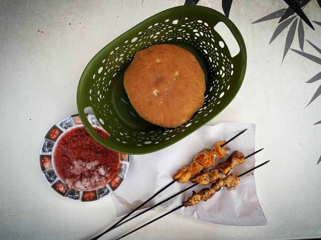 My food soon arrives, delivered by a friend of the cook, who seems to be volunteering as restaurant’s lone, ad hoc waiter. Three skewers of grilled chicken accompanied by khobz, a Moroccan bread, and matboukha, a kind of Moroccan salsa notable for its paprika. And nothing to drink. An austere meal, to be sure, but one whose simplicity focuses one’s attention on its elements, few as they are: animal flesh suffused with woodsmoke; the umami-rich slurry of tomato; the saltless bread there to bolster satiety. All for 20 Moroccan dirham, or $2 USD. It’s an astonishing plate of food for that price, this meal I’m given.
