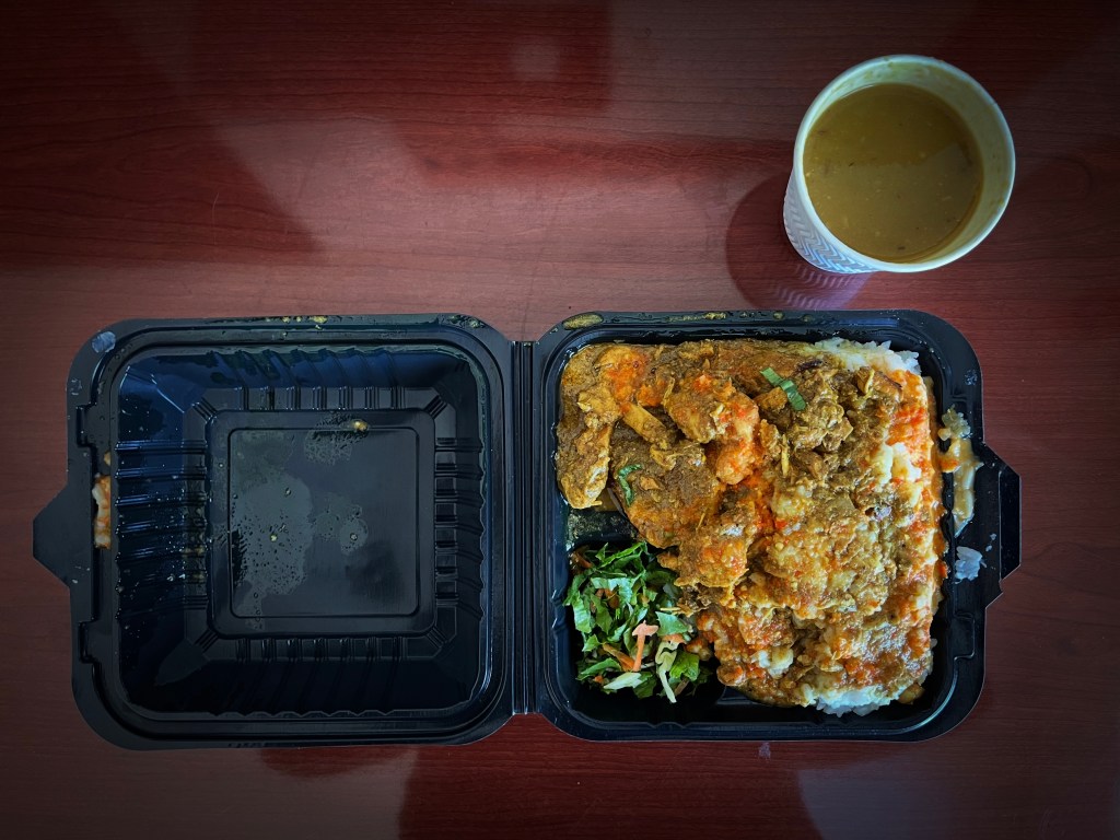 The service window soon opened, and out came my clamshell: over two pounds of rice and chicken curry, served with a Styrofoam cup of green-lentil dhal, all for $6.70 USD. I took my food with thanks, and then sat on a curb just beyond The Cottage’s parking lot. With my restaurant-issued plastic fork in hand, I bent to my meal and ate.