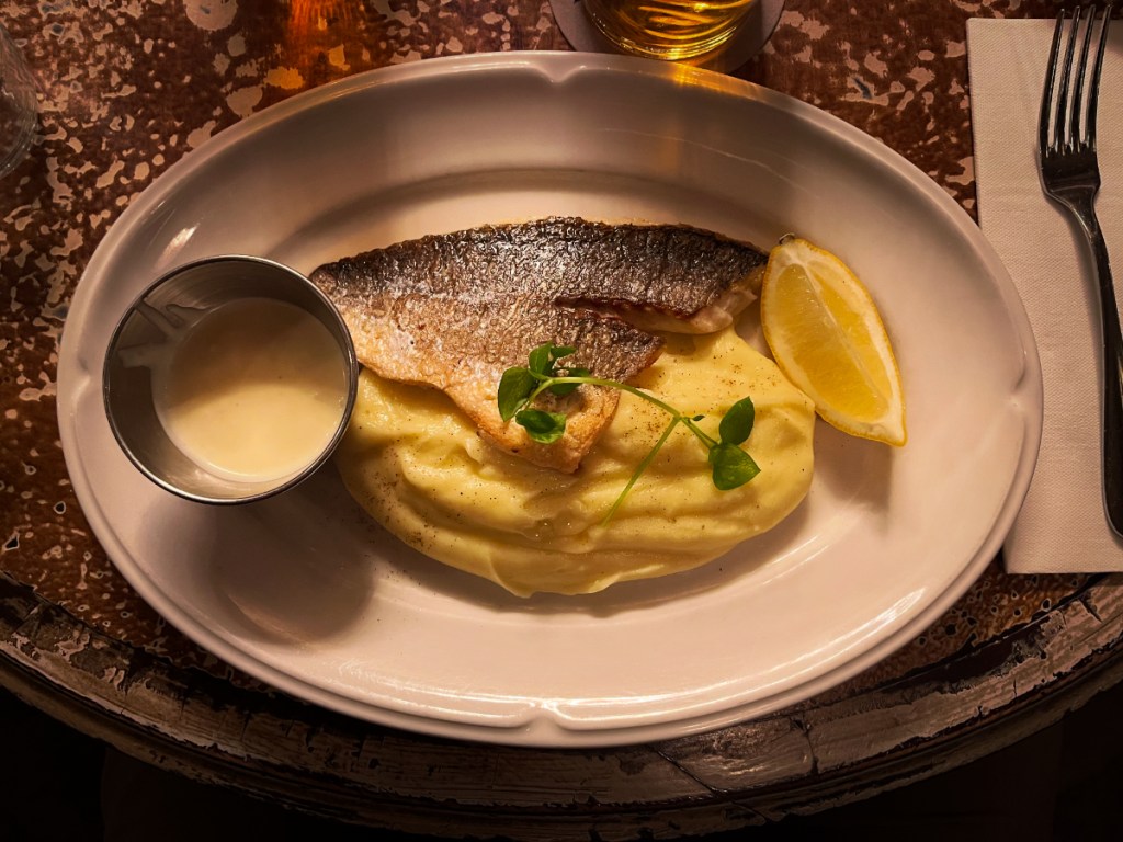 Good as these snails are, it’s the bream that steals the show: a dazzling, four-once filet of fish, pan-seared in such a way as to make the skin almost chicharron-like in its crackly crispiness, while leaving the uber-delicate flesh, underneath, as pillowy and pliant as the dreams of a newborn child. My filet de daurade is a master class of fish cookery. It’s the embodiment of culinary exactitude, the epitome of French technique perfected. It’s Hugo’s Hunchback of Notre-Dame. It’s Debussy’s Clair de lune. It’s Duchamp’s Nude Descending a Staircase. This fish is a French national treasure. It’s everything I ever want from a plate of food. And it’s a motherfucking triumph. Bravo, Le Petit Poucet, bravo.