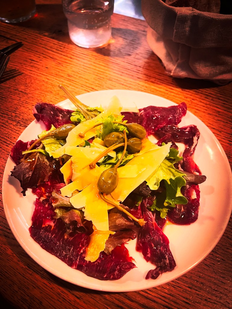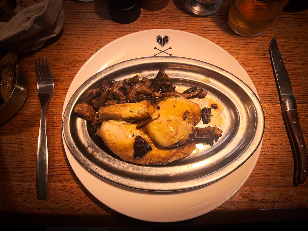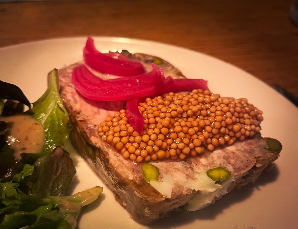 I sit at the bar and order beer in terrible French. My server smiles indulgently, the way adults will quietly suffer the conduct of dimwitted children, and gently moves the conversation to English, suggesting I start my meal with a couple of Tonton’s most beloved stalwarts—carpaccio de boeuf de salers fume and the pate croute volaille et fois-gras—before proceeding to a main course of ½ coquelet, accompanied by an order of aligot, and a side of champignons en persillade.