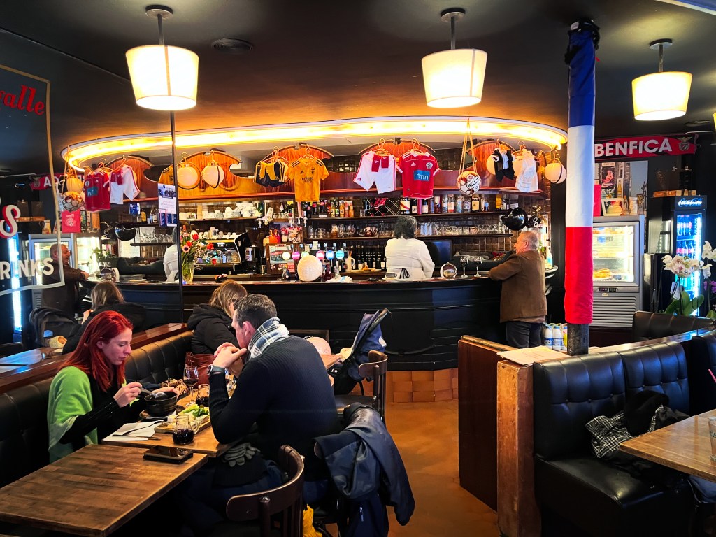 It’s a loving embrace, this café, and almost cinematic in its décor with its red walls, bent-wood chairs, and black-and-white tile floors of your Parisian dreams. As a restaurant, Au Rendez-Vous is pleasantly funky and worn-at-the-edges cool. It’s a proverbial warm bath; a broken-in bedroom slipper. The kind of place where old men stand around the bar, pounding glasses of Kronenberg, debating the virtues of socialism, and petting, as they do, the little Shih Tzu who lives in a dog bed atop the counter.