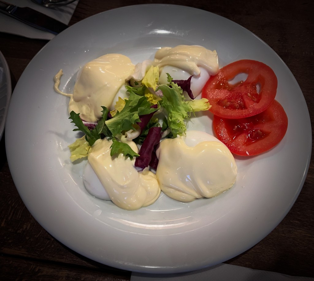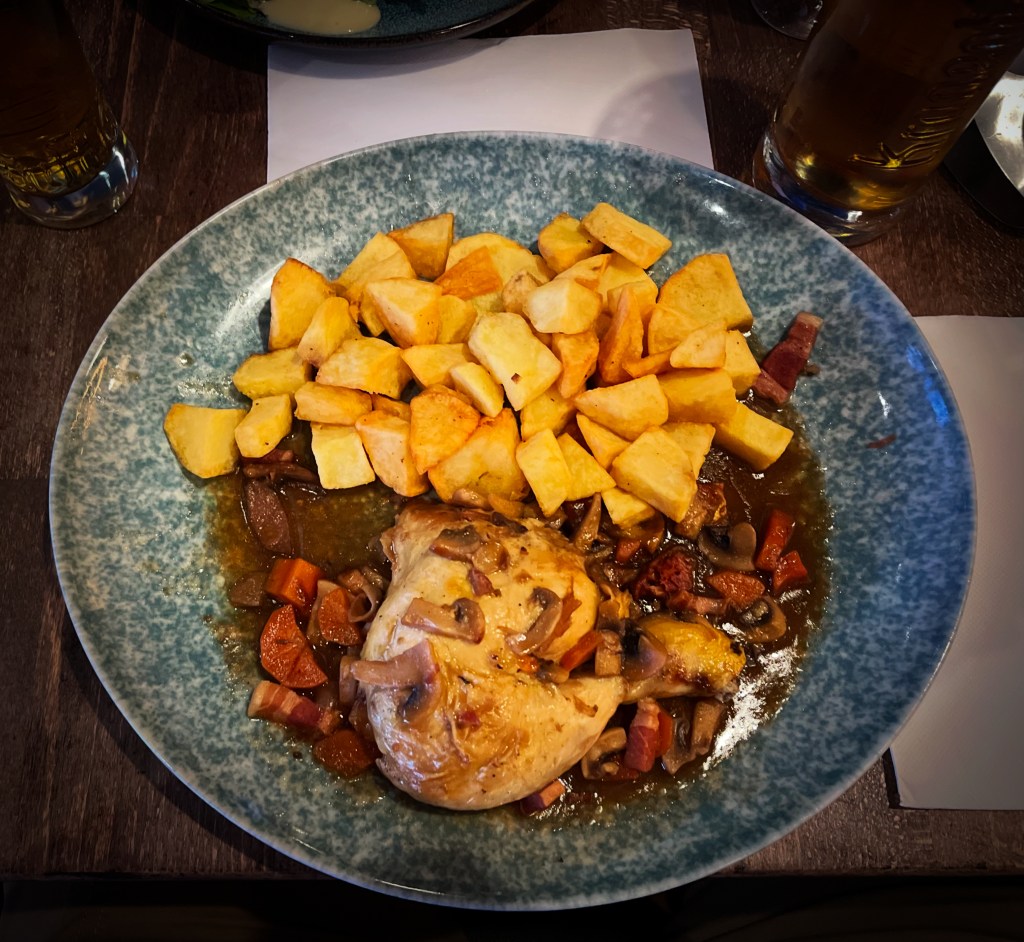 The food I’m soon given is decidedly workmanlike in technique—I’m expecting this—but it’s also soul-affirming in its deliciousness, and for the way it so perfectly replicates the love and care of a home-cooked meal. It’s as if someone’s grand-mere has just prepared my food. My chicken is perfectly roasted and umami-rich with its mushrooms, lardon of bacon, and jus that punches well above its weight. The French onion soup is homey and rich. But it’s the oeuf mayonnaise, people, that’s the star of this show, and for reasons that defy all explanation.