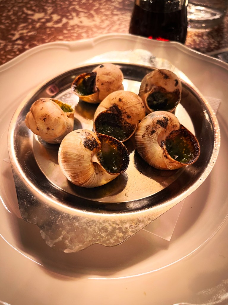 I order escargot because I’m in Paris, after all, and why the fuck not? I also order the filet de daurade et beurre blanc, or sea bream in butter sauce. My snails arrive first, and they are magnificent. Because underneath all that garlic and parsley, I find the cleanest tasting half-dozen gastropods I’ve ever had. They’re the kind of snails one finds only in France: lovingly hand-fed for two weeks on Belgium endive before they’re shuffled off to buttery graves.